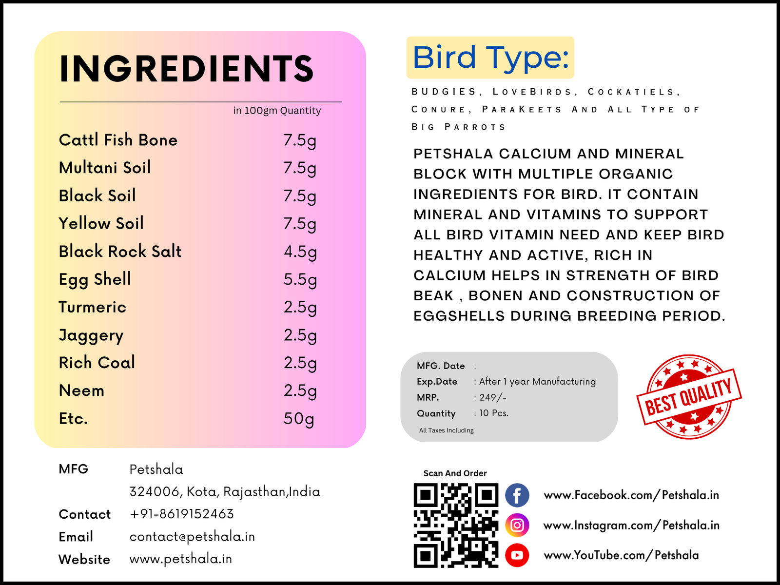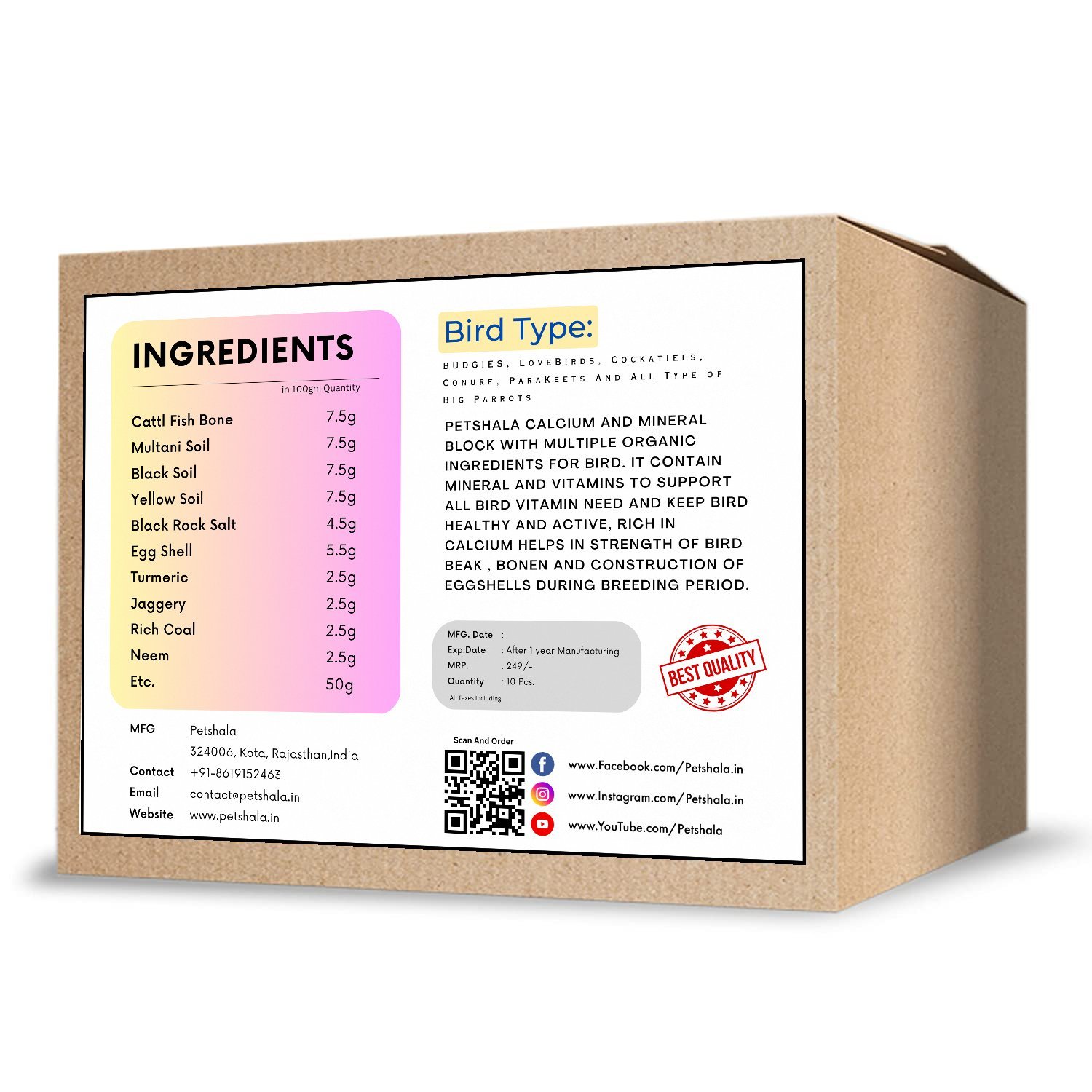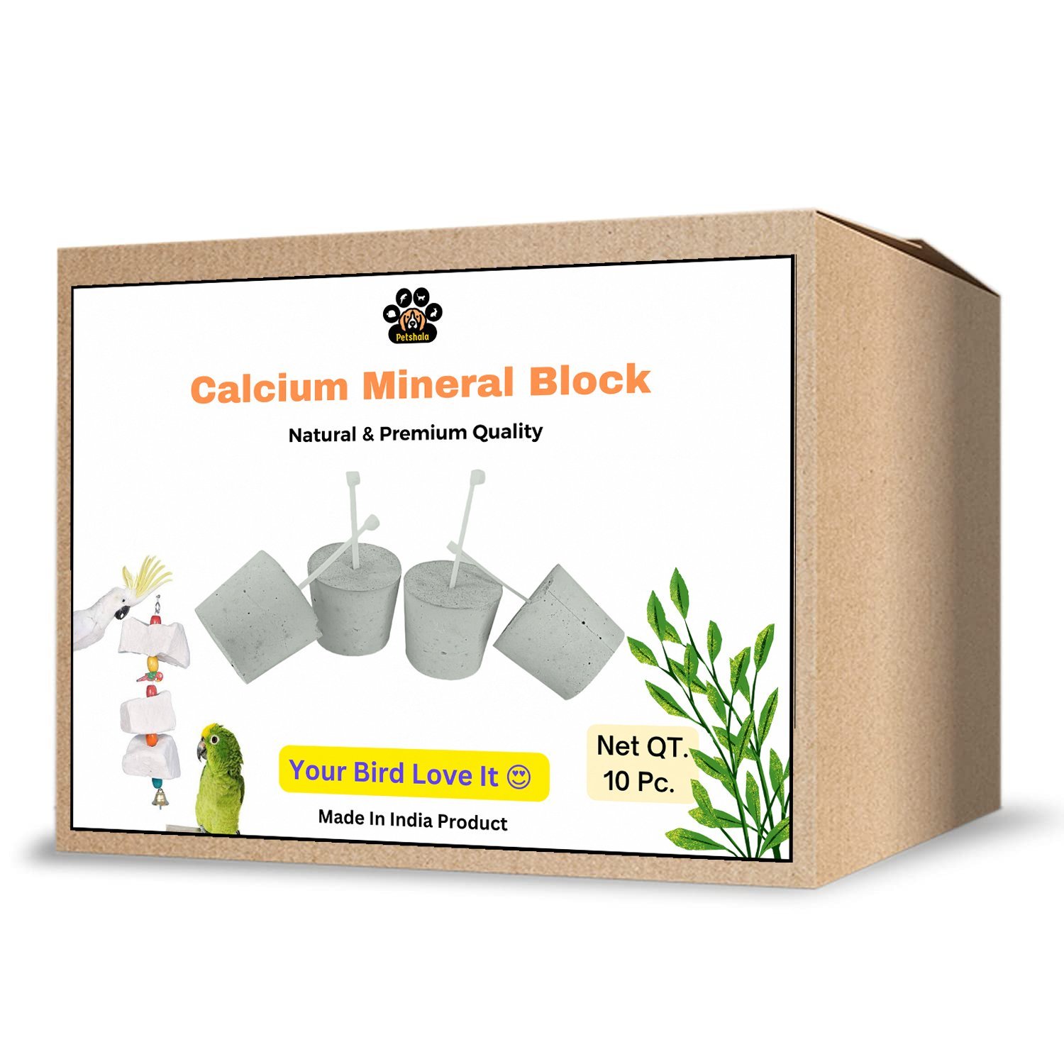 Petshala Calcium Block And Mineral Block With Multiple Organic Ingredients For Birds. It Contain Mineral And Vitamins To Support All Bird Vitamin Need And Keep Bird Healthy And Active Rich In Calcium Help In Strength Of Bird Beak, Bones And Construction Of Eggshell During Breeding Period.